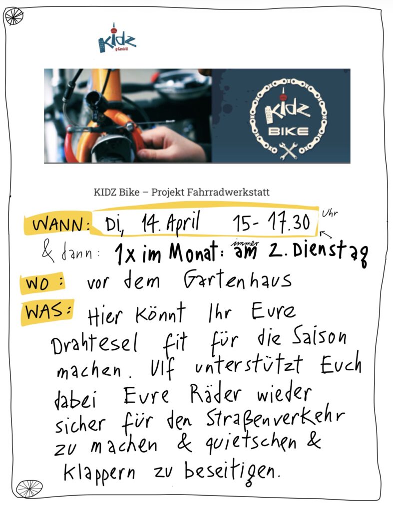 Ab 14.April kommt einmal im Monat – immer am 2. Dienstag – zwischen 15.30 und 17.30 Ulf mit dem Kidz Bike hier vorbei und bietet Euch seine Unterstützung dabei an, dass Ihr Eure Fahrräder wieder verkehrstauglich und Quietschfrei bekommt.
